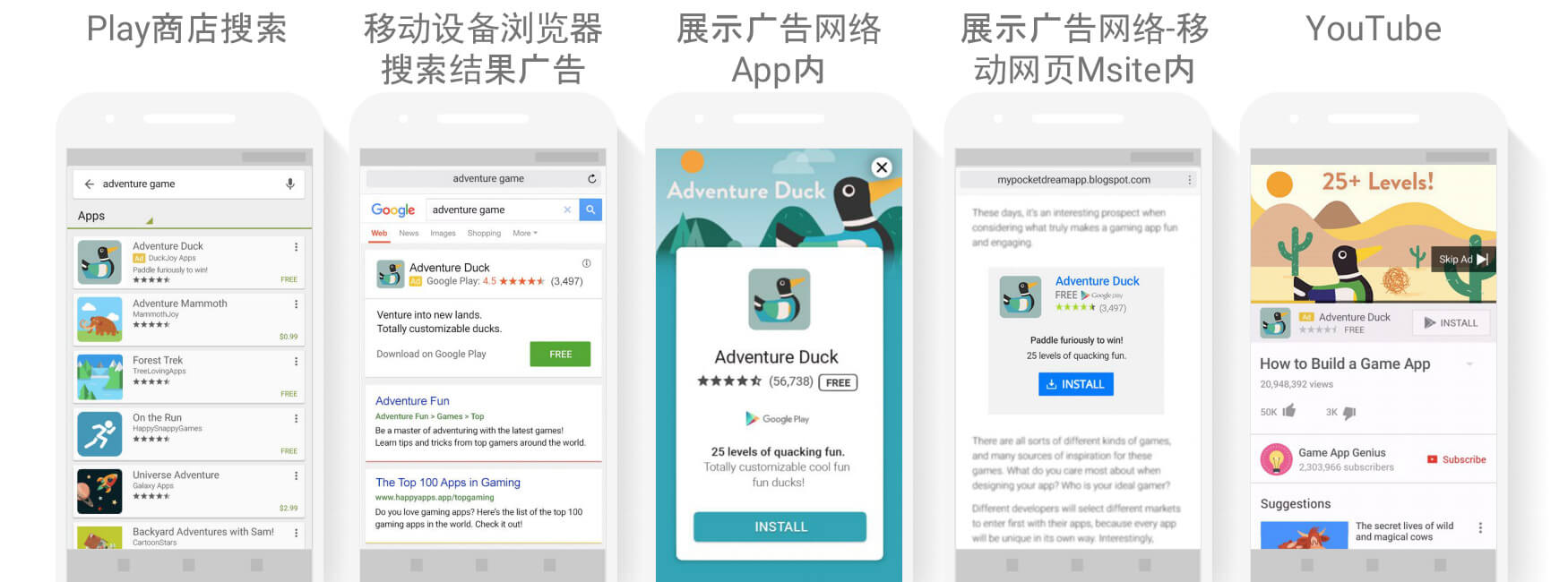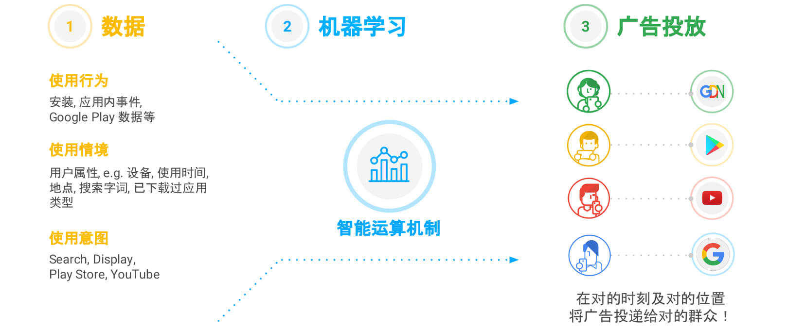 UAC使用Google独特的机器学习技术,根据您的业务目标,通过Google Play,Google.com,YouTube以及数百万个展示广告网络中的网站和应用,帮助您找到最重要的客户