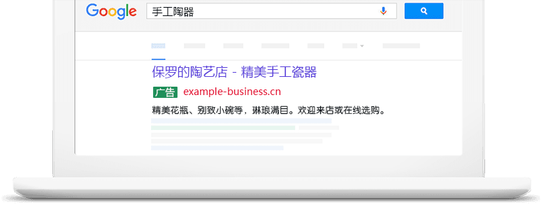 如果用户在个人电脑、平板电脑和智能手机上输入到 Google 搜索框的字词与您的关键字匹配,您的广告就能够显示在搜索结果上方。您只需在用户点击广告时付费,而用户在点击广告后则会转到您的网站或给您的商家致电。每天,Google 上都会发生数百万次搜索,因此您自然可以确保您的客户会注意到您的品牌、考虑您提供的产品或服务并采取行动。