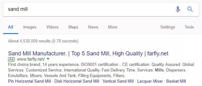 搜索广告的核心就是选对关键词,法孚莱的关键词包括了产品词(Sand mill,Bead mill,emulsifier,homogenizer)和品牌词(farfly)。一般B2B的推广都这么做,但大家最容易忽视一点,就是不同国家的用词习惯和文化。而法孚莱对这一点深有体会。
