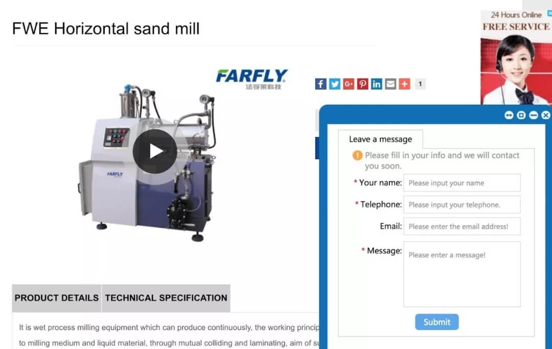 产品介绍页面配有视频,还有各种直接与公司取得联系,获得询盘的窗口